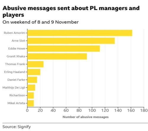 英超方面,鲁本-阿莫林、阿恩-斯洛特和埃迪-豪是受辱骂最多的主帅;而WSL赛事中,切尔西及其主帅索尼娅-邦帕斯托承受了50%的辱骂。